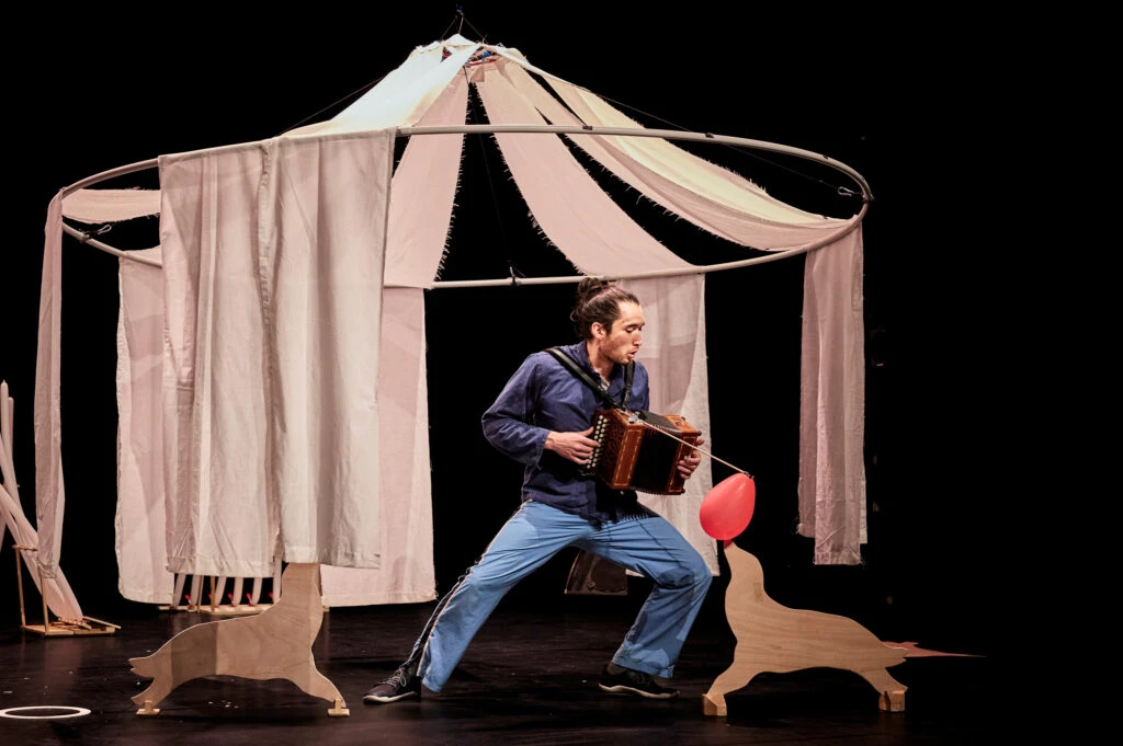 Jongleringskollage som förenar cirkus- och konsthistoria, absurdism och livsglädje i en värld av plywood, ballonger och gaffatejp.