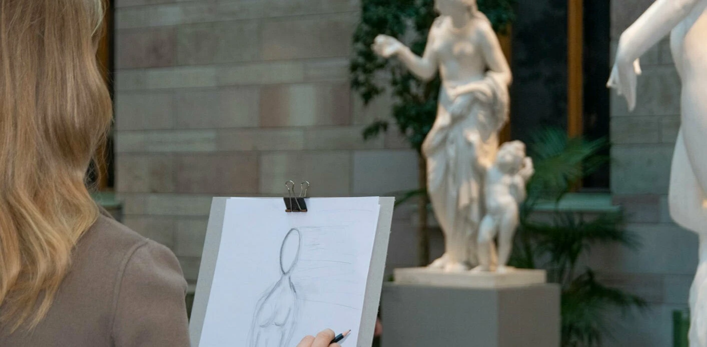 Prova på att teckna kroki med skulpturer som modeller. Vi tecknar dem ur olika vinklar och i olika tempo och övar ögat i att se former, riktningar och rörelser i något som är helt stilla. Vässa blicken och njut av atmosfären i Skulpturgården – museets kanske vackraste rum!