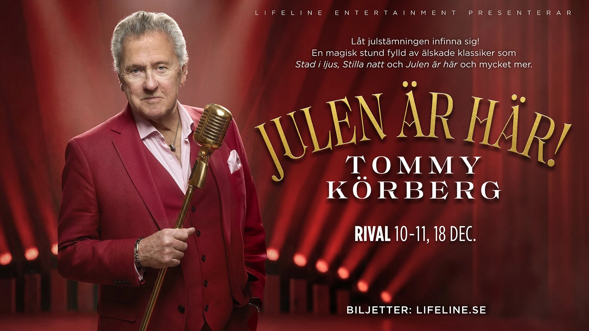 Med sin kraftfulla röst, sitt uttryck och sin närvaro skapar Tommy Körberg en atmosfär som berör på djupet – från stillsam eftertanke till storslagen musikalisk glädje. Här får du höra älskade sånger som Stad i ljus, Stilla natt och Julen är här, tillsammans med många fler välkända julmelodier.